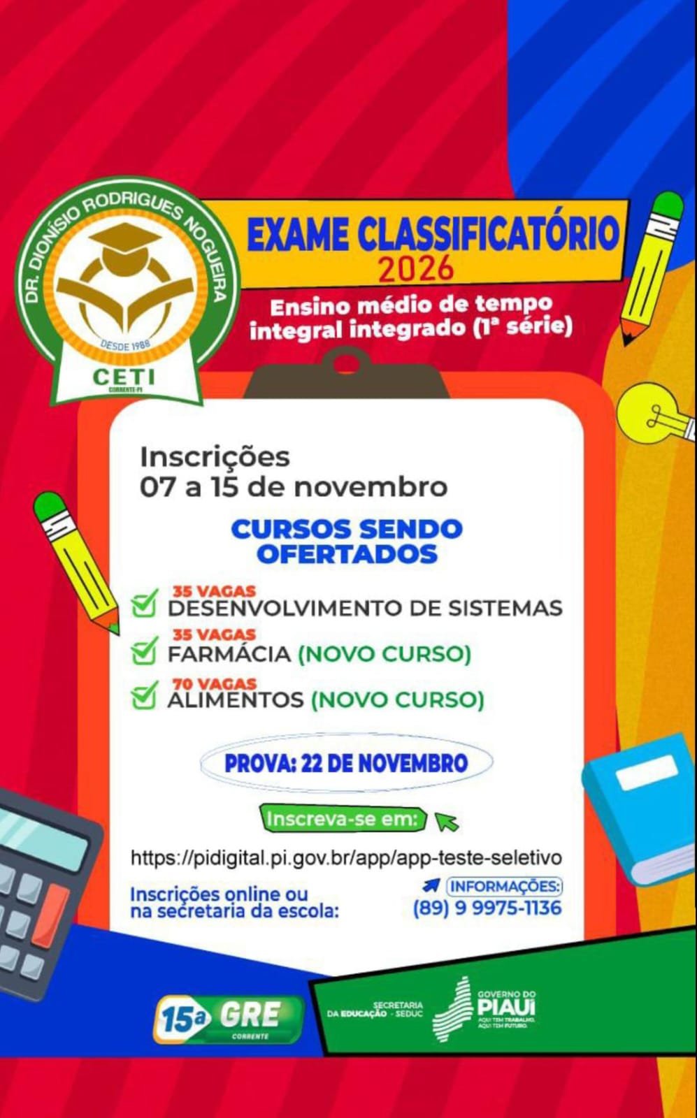 Seguem abertas as inscrições para o exame classificatório 2026 do CETI. Dr. Dionísio Rodrigues Nogueira em Corrente-PI.