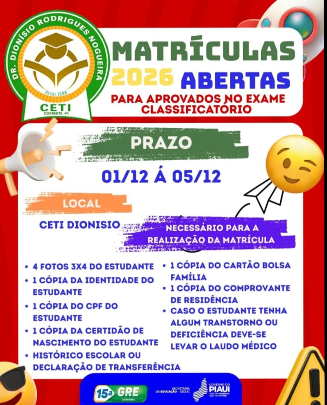 CORRENTE (PI) — O CETI Dr. Dionisio Rodrigues Nogueira, localizado em Corrente, está com matrículas abertas para o ano letivo de 2026. A oportunidade é destinada exclusivamente aos estudantes aprovados no exame classificatório.