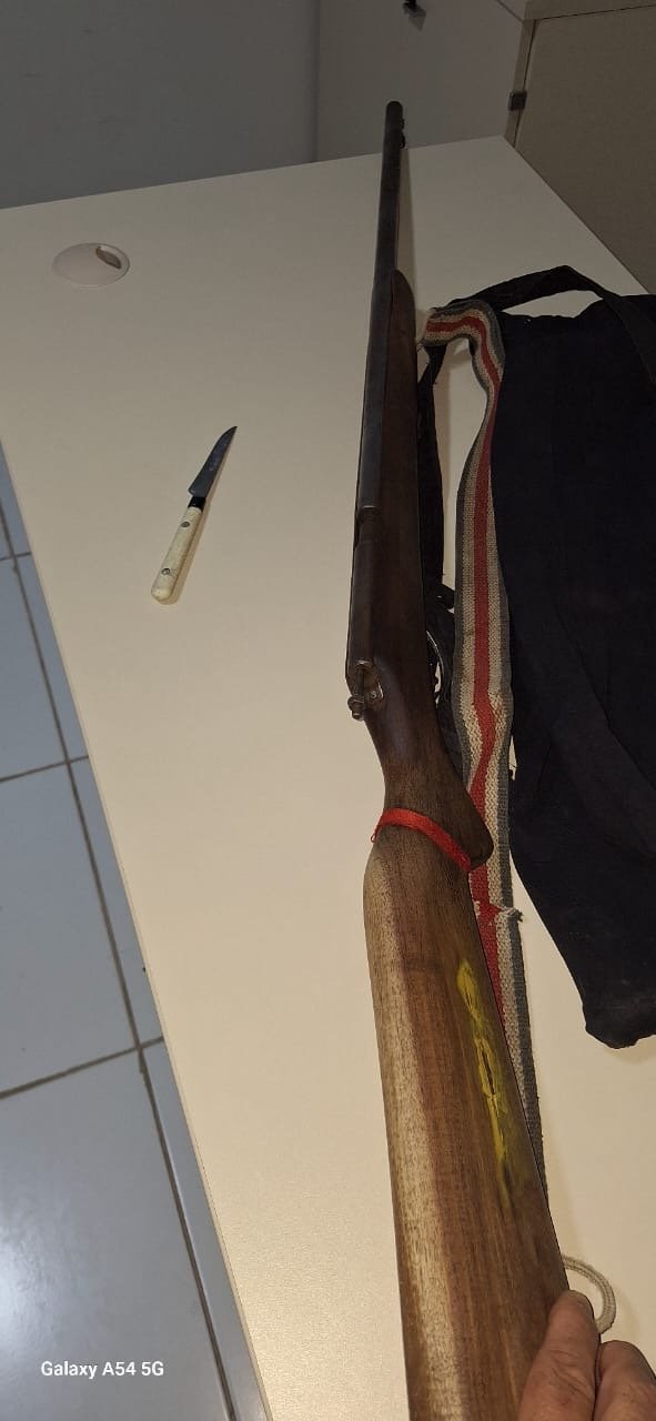 A guarnição deslocou-se até o local e constatou a veracidade dos fatos. Após diálogo com o suspeito, os policiais conseguiram convencê-lo a entregar a arma, uma espingarda de fabricação caseira, que estava dentro de sua residência.