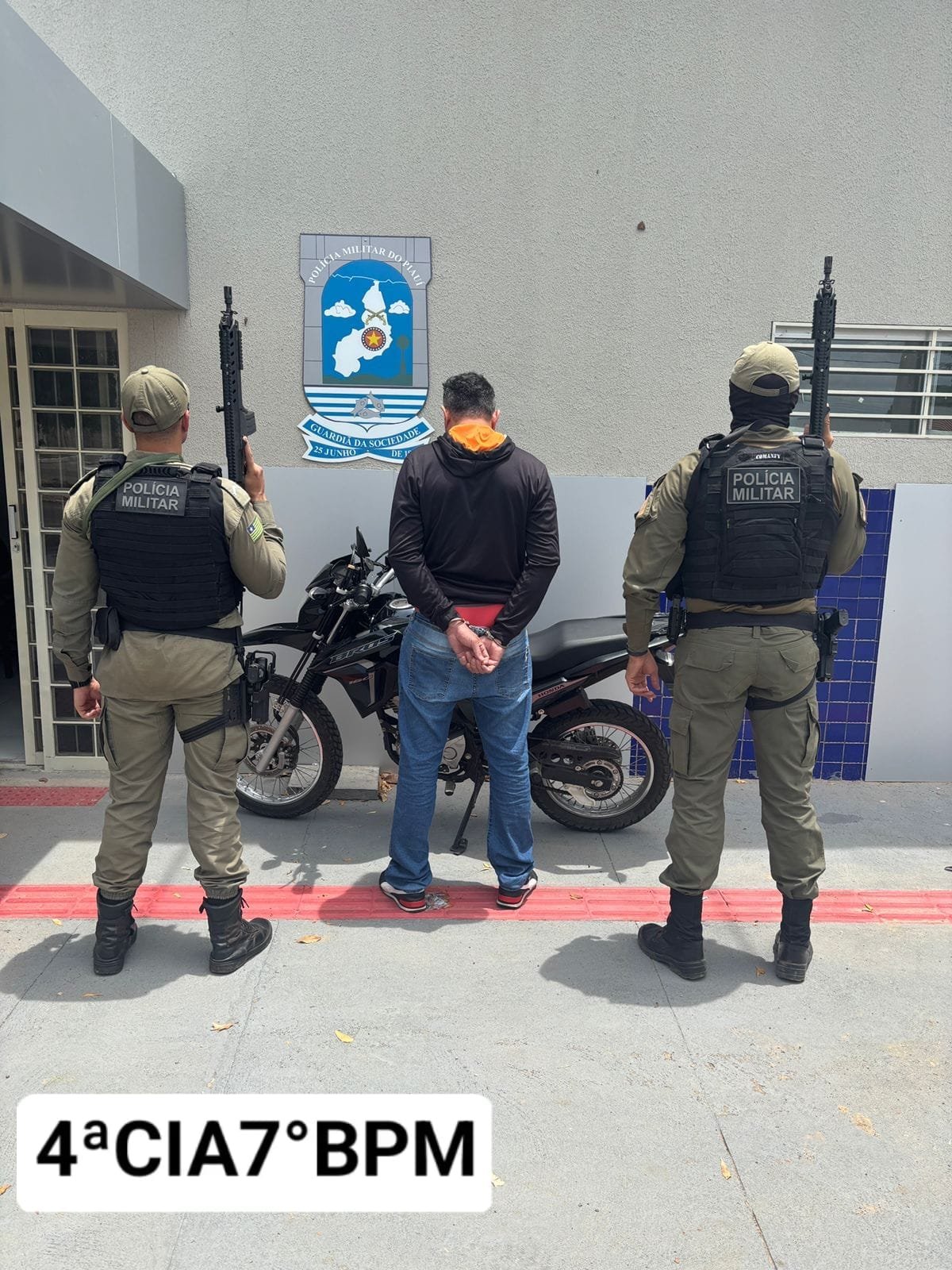 Por volta das 11 horas desta quinta-feira (20), uma guarnição da Polícia Militar, durante patrulhamento de rotina na Avenida Sérgio Gama, no centro de Avelino Lopes, avistou um indivíduo em atitude suspeita. O suspeito estava em uma motocicleta Honda Bros, preta, modelo 2024/2024, com placa SYZ-8H20, vestindo jaqueta preta e capacete.