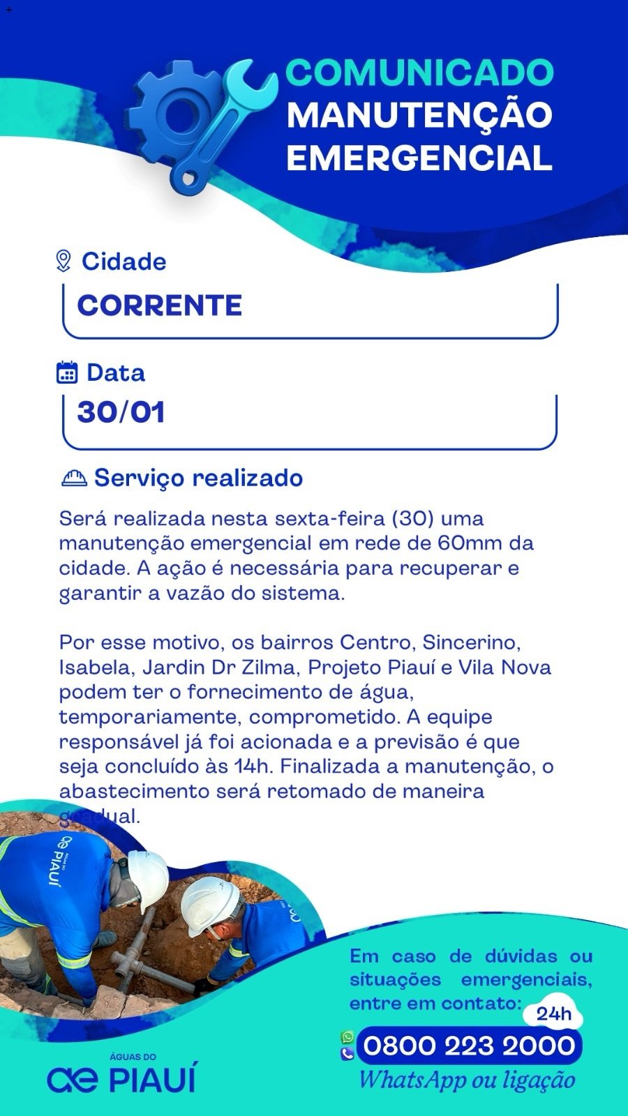 Uma manutenção emergencial na rede de abastecimento de água será realizada nesta sexta-feira, 30 de janeiro, no município de Corrente. O serviço, executado em uma tubulação de 60 milímetros, é considerado essencial para recuperar e garantir a vazão adequada do sistema de distribuição.
