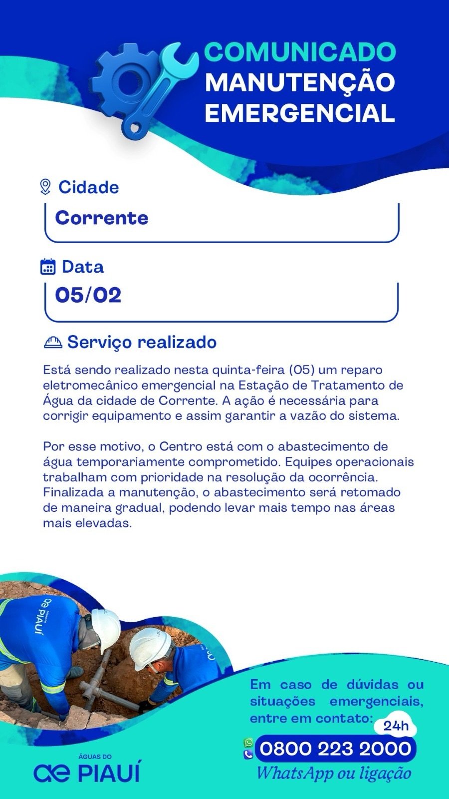 Moradores de Corrente podem enfrentar falta ou redução no abastecimento de água nesta quinta-feira (05) devido a uma manutenção emergencial na Estação de Tratamento de Água do município.