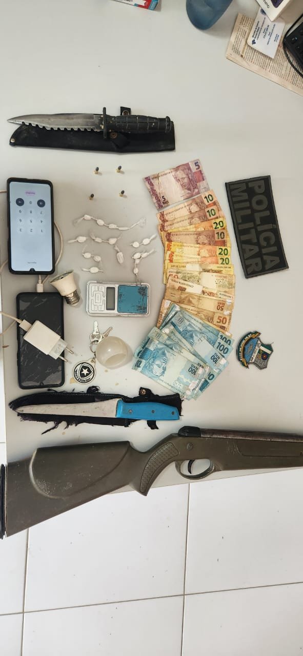 Já com T. além da quantia de R$ 1.040,00 em espécie, foram apreendidos materiais indicativos de envolvimento com tráfico: uma balança de precisão, duas facas, uma arma artesanal de calibre .22 e quatro munições do mesmo calibre.