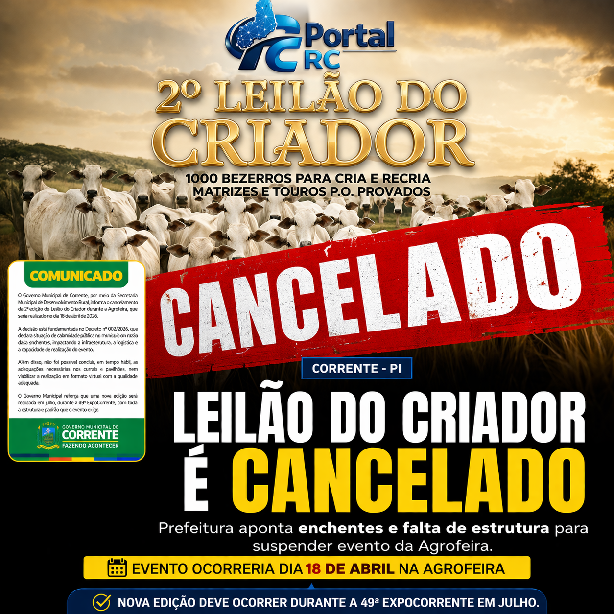 A Prefeitura de Corrente anunciou o cancelamento da 2ª edição do Leilão do Criador, que estava prevista para ocorrer no dia 18 de abril de 2026, durante a Agrofeira do município.