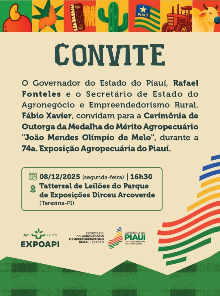 A cerimônia de outorga da medalha ocorre nesta segunda-feira, 08 de dezembro de 2025, às 16h30, no Parque de Exposição Dirceu Arcoverde, em Teresina. O evento reúne autoridades, produtores rurais, entidades do agronegócio e representantes da sociedade civil comprometidos com o desenvolvimento sustentável do campo piauiense.